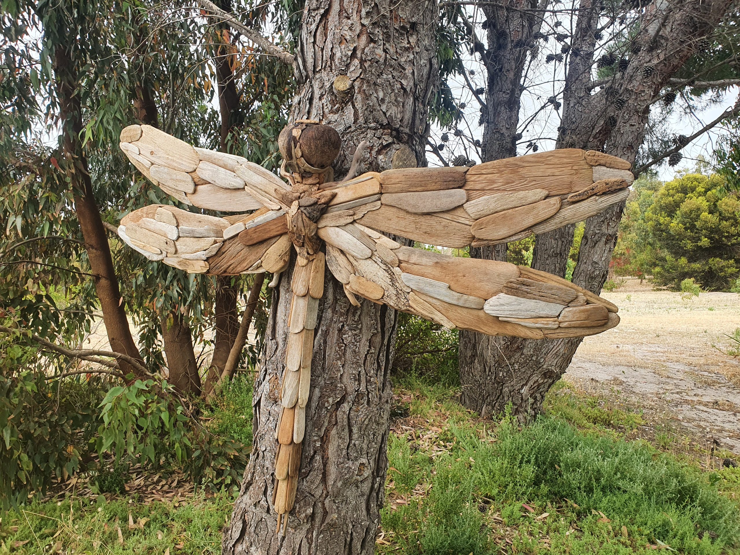 It is local Darwin folklore that the appearance of dragonflies signals the change of seasons from wet to dry. Made from driftwood collected from all over Australia.  This piece measure 140cm across the wings.